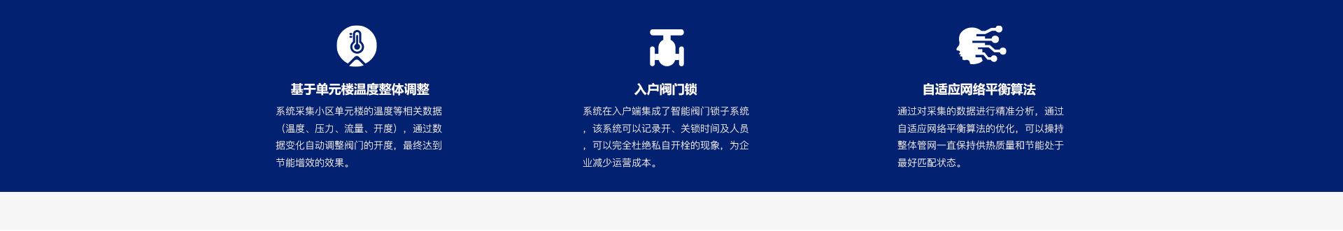 集合大數(shù)據(jù)技術、物聯(lián)網(wǎng)技術、自適應網(wǎng)絡平衡算法、智能閥門、智能閥門鎖為一體,實現(xiàn)對供熱系統(tǒng)的自動化與智能化的平衡管理系統(tǒng)。
